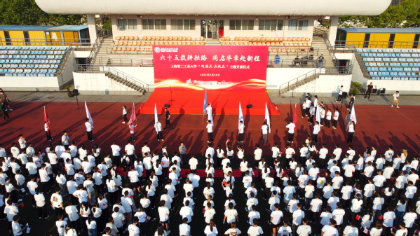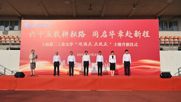 为庆祝中华人民共和国成立76周年,庆祝学校建校65周年,9月28日清晨,学校在体育场举行了以“六十五载耕耘路 同启华章赴新程”为主题的升旗仪式。校领导,相关职能部门、各学院负责人、学生工作负责人,师生代表1400余人参加仪式。仪式由我校党委副书记吴沛东主持。