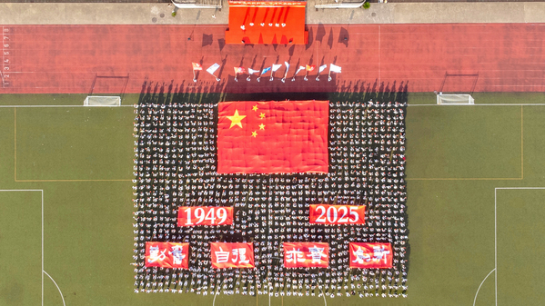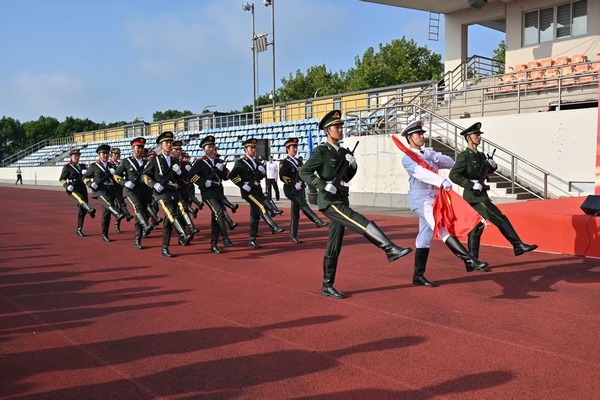 高歌以寄赤子情,追光逐梦启新程。《我和我的祖国》歌声响起,伴随歌声,现场同学们托举五星红旗穿越方阵,同学们通力合作、默契配合,同时展开“勤奋、自强、求实、创新”的校风标语,与巨幅国旗交相辉映,成为现场最动人的风景。