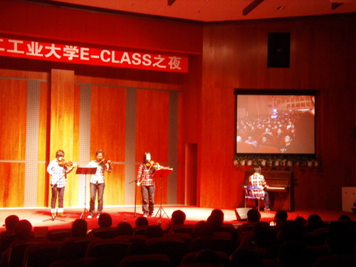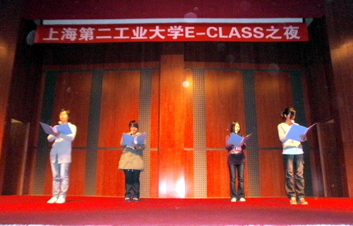 2011年11月28日,由我校易班发展中心举办的“上海第二工业大学E-class之夜庆典晚会”在400人报告厅举行。校党委副书记李世平,学生处处长经晓峰、副处长淦爱品、许燕平,电子学院党总支副书记孙坚勇,计算机学院党总支副书记董金龙,经管学院党总支副书记谈立群,人文学院党总支副书记王秀红,理学院党总支副书记黄晓峰以及辅导员和学生代表出席晚会。
