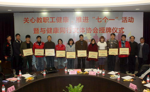 会上,举行了与健康同行文体协会的授牌仪式。在18个文体协会中,既有我校传统项目,也有新成立的如太极拳、毽球、剑术等。丰富多样的文体协会必定会给广大会员带来多姿多彩的文体生活,促进大家的身心健康!