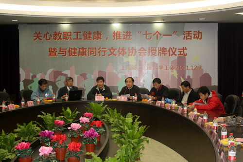 党委副书记、校体委副主任李世平在讲话中充分肯定“七个一”活动是促进教职工健康的好平台,推行起来简单易行易记。强调学校发展、荣获上海市群体先进都离不开大家的积极参与。一定要将健康问题放在首位,常抓不懈。文体协会是很好的活动载体,以点带面,生动活泼,良好的校园氛围可以培养广大教工健康的心态和体质!