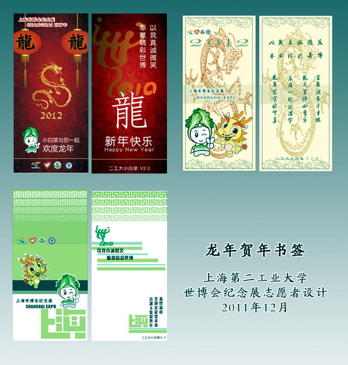 在2012新年来临之际,前往上海世博会纪念展的游客都能收到一份特殊的新年礼物,一套由我校应用艺术与设计学院志愿者设计制作的龙年书签。