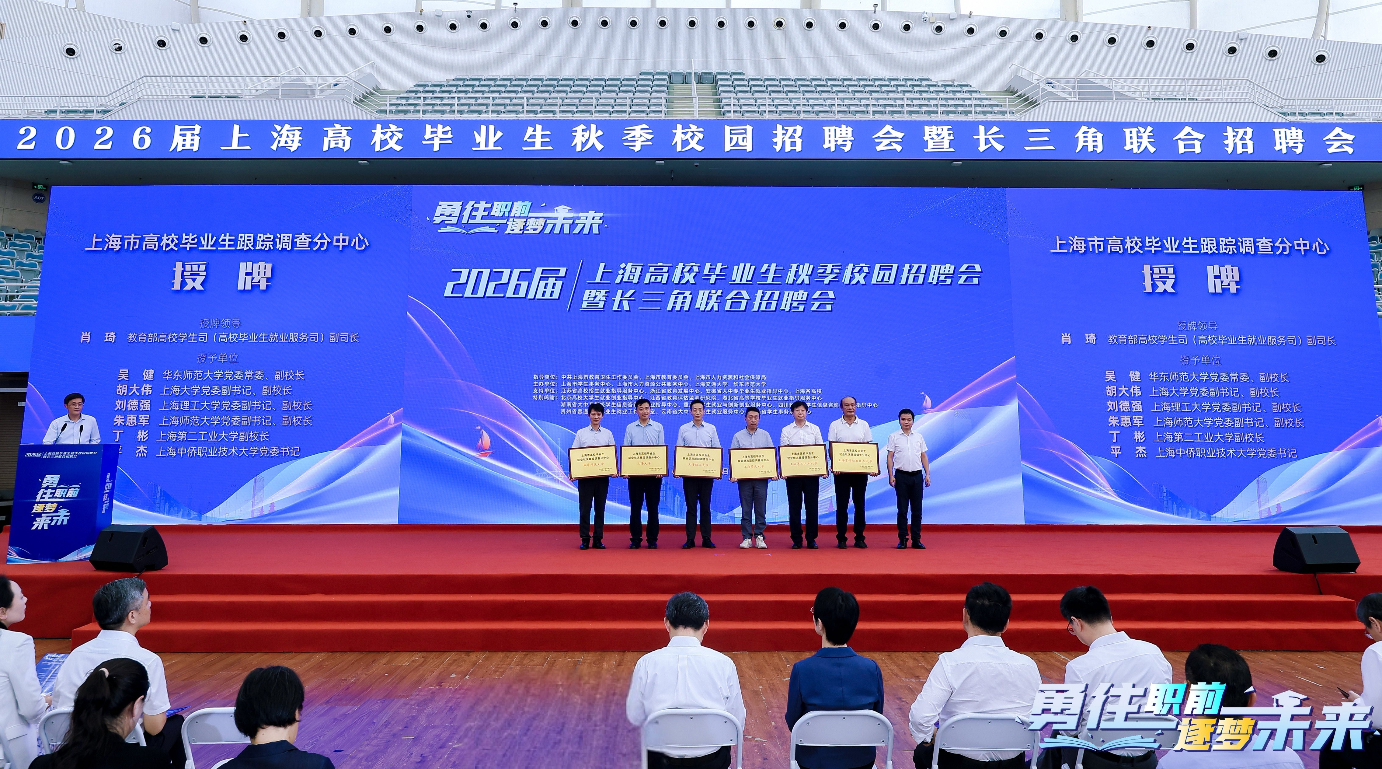 9月26日,“2026届上海高校毕业生秋季校园招聘会暨长三角联合招聘会”在上海交通大学闵行校区举办。副市长解冬宣布活动启动,上海交通大学校长丁奎岭、上海市教委主任周亚明等出席活动。我校副校长丁彬应邀参会,代表学校接受“上海市高校毕业生跟踪调查分中心”授牌。