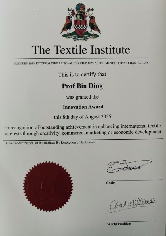 日前,英国纺织学会(The Textile Institute)颁布2025年创新奖(The Textile Institute Innovation Award)获奖名单,我校丁彬教授位列其中,成为该奖项自1990年设立以来首位获此荣誉的华人科学家,彰显中国科研力量在国际纺织创新领域的原创性成果与产业化影响力已获得世界级的认可。