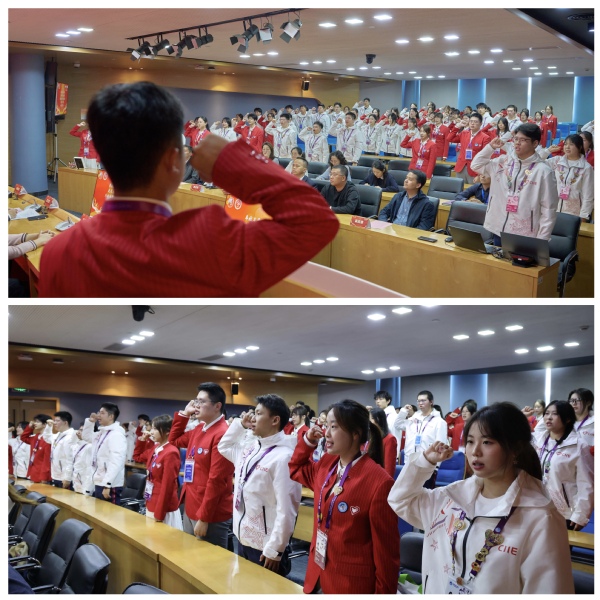 在全场的见证下,第八届进博会志愿者集体宣誓,铿锵有力的誓言彰显了“小叶子”们服务进博、奉献青春的坚定信念。