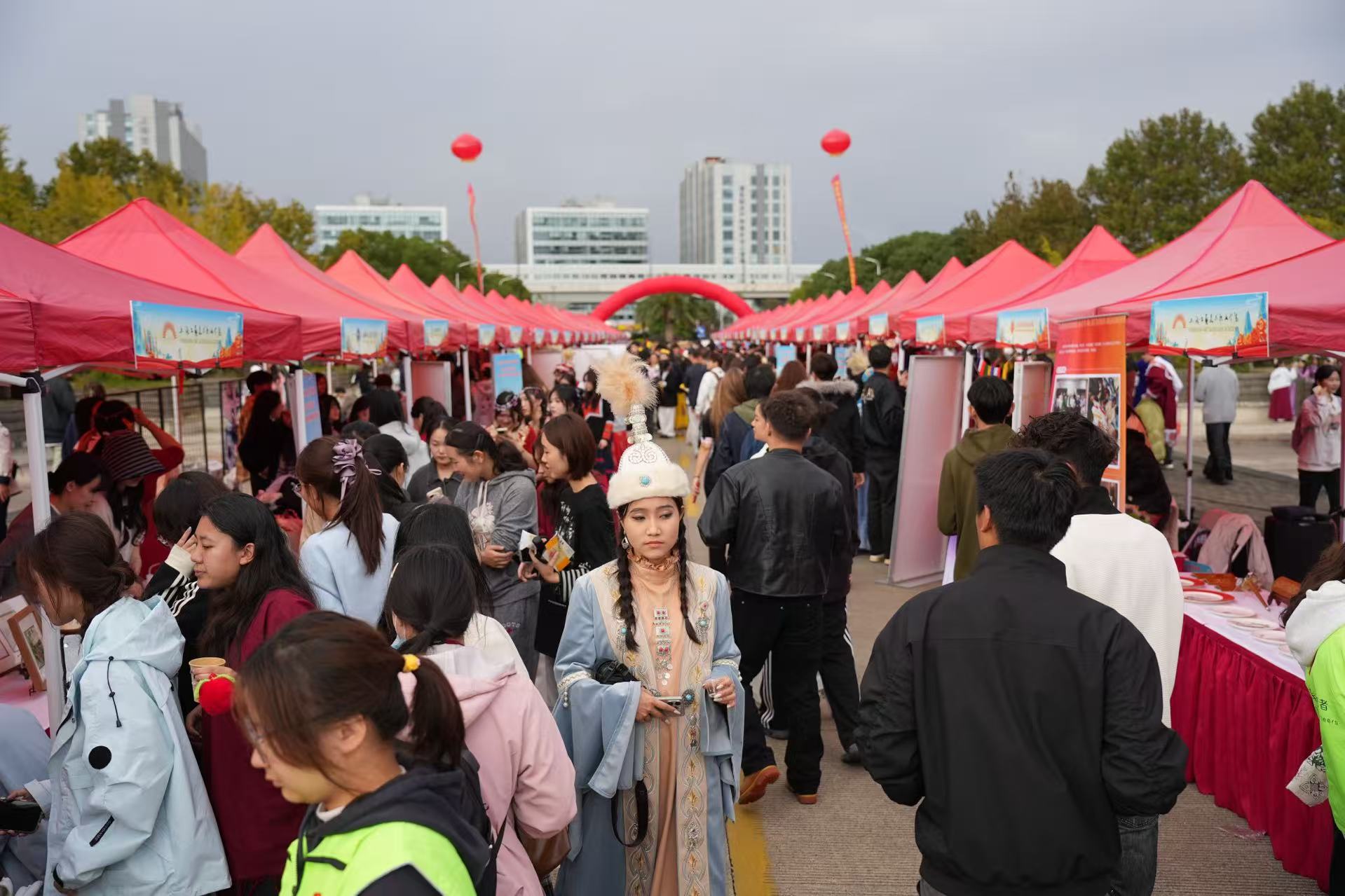 在民族特色文化展示和民族游戏互动体验区,各高校以“民族村”的形式展示民俗文化、民族风情,每个帐篷前都挂起了民族特色饰品、展示了民族游戏活动,吸引了大批学生驻足并参与体验,让学生在视听盛宴中体验了民族风情。在海派文化展示与体验区,上海国家级非物质文化遗产——剪纸、芦苇画、绒绣等,展现了海派文化的独特魅力,让现场的师生沉浸式地感受了上海非遗的传统文化之美。