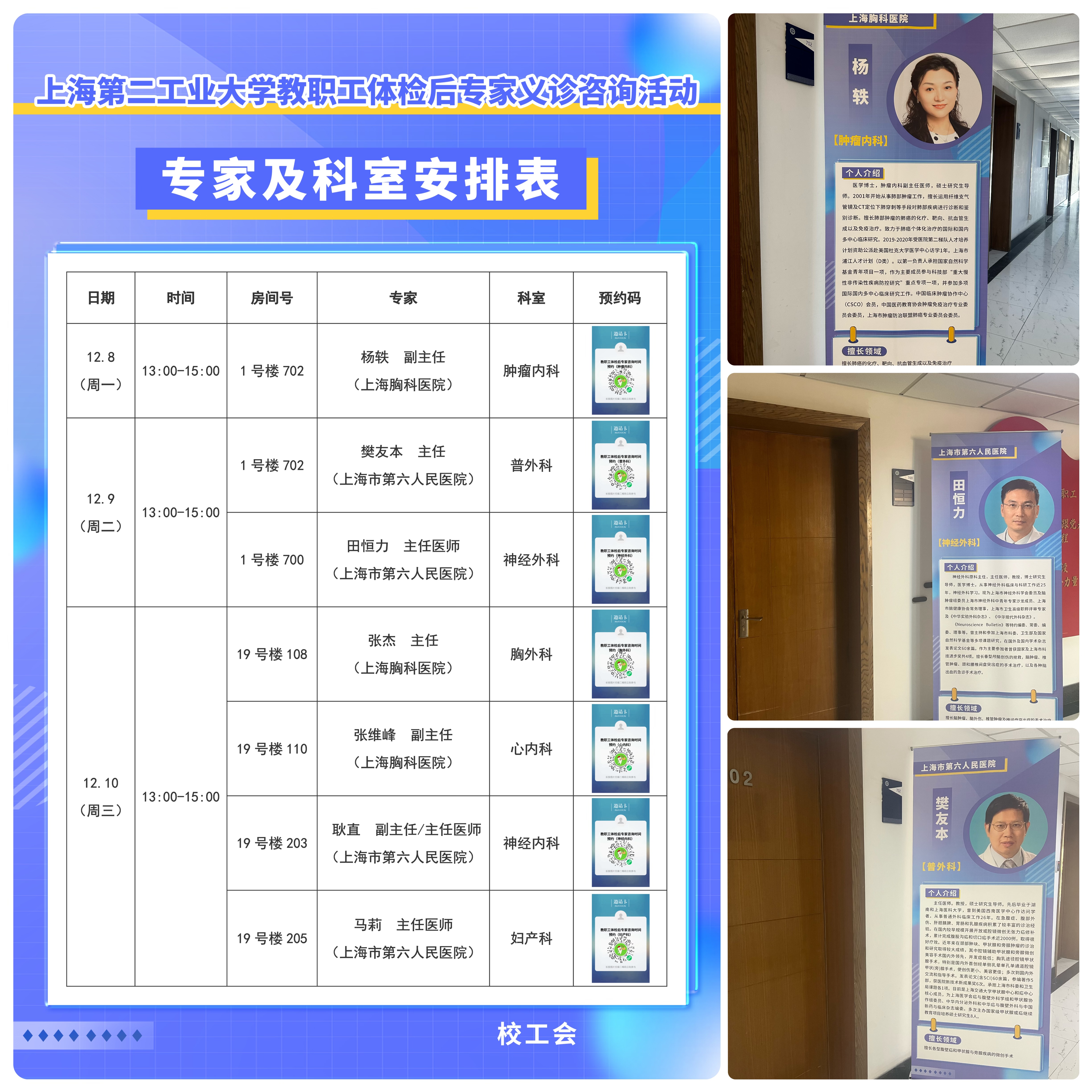 此次义诊咨询活动筹备充分,校工会细致推进各项前期工作,保障服务精准高效。依托学校与共建合作医院的优质资源,在校研究生处的协助支持下,校工会精准对接医疗需求,专门邀请上海胸科医院、上海市第六人民医院肿瘤内科、胸外科、心内科、普外科、神经外科、神经内科、妇产科等科室的专家为教职工提供专业问诊服务。为提升就诊便捷度与体验感,校工会开发设计预约小程序,方便教职工按需预约,对应科室专家及就诊时间,大幅缩短等候时长。同时,校工会统筹做好全程组织协调,为每位专家配备专属对接工作人员,全程做好一对一接待协调与候诊指引,指导候诊教职工提前下载体检报告,保障问诊有序推进。