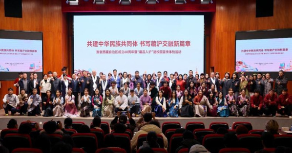12月17日,致敬西藏自治区成立60周年暨“藏品入沪”大中小学思政教育一体化育人活动在上海第二工业大学举行。相关单位负责人,相关高校、中学各民族师生出席活动。据了解,活动以“共建中华民族共同体书写藏沪交融新篇章”为主线,通过西藏自治区成立60周年图文展、非遗体验、特产品鉴、政策宣讲、文艺交流等载体,为学生们打造了一堂覆盖多学段、联结多学校的“大思政课”。
