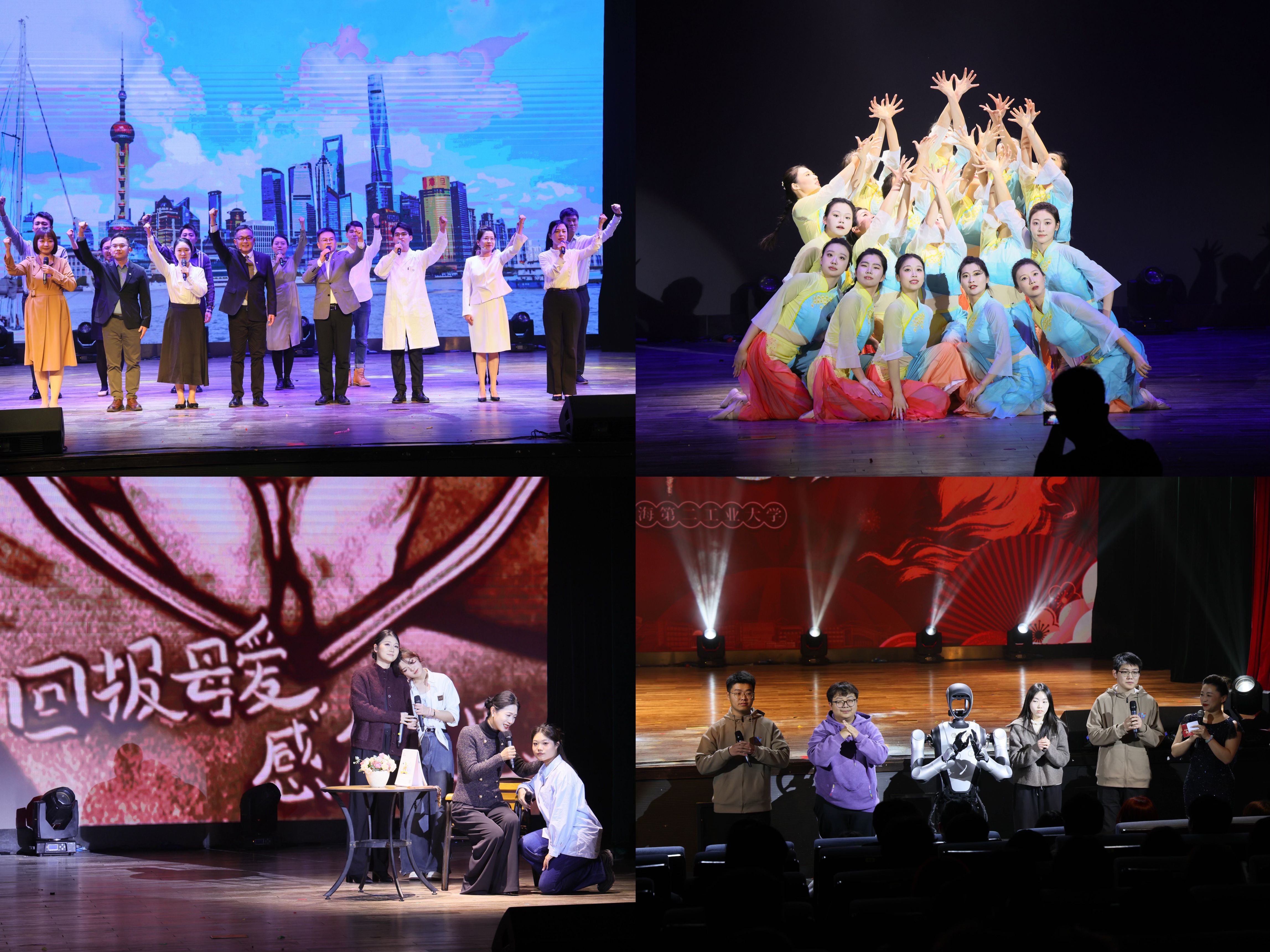 本次晚会聚焦“美育浸润”与“艺科融合”,以歌舞、器乐、朗诵等艺术表演为载体,呈现了一系列师生共创、形式新颖的文艺作品。多媒体舞蹈《雨后》以古老传说为蓝本,通过动态视觉交互与舞者精准联动,营造出虚实相生的沉浸观感。朗诵《融汇江海 奔向一流》由各学院教师代表联袂演绎,铿锵有力地表达了学校在“十五五”新征程中勇担使命、争创一流的坚定决心。歌曲联唱《鼓乐花开颂中华》融合烽火记忆与时代新声,在经典旋律中激荡深沉的家国情怀。由师生团队带来的机器人互动节目《炊事班长送祝福》,通过生动活泼的人机对话与现场互动,展现了人工智能在校园生活中的创新应用,体现了工科院校的科技温度与育人活力。