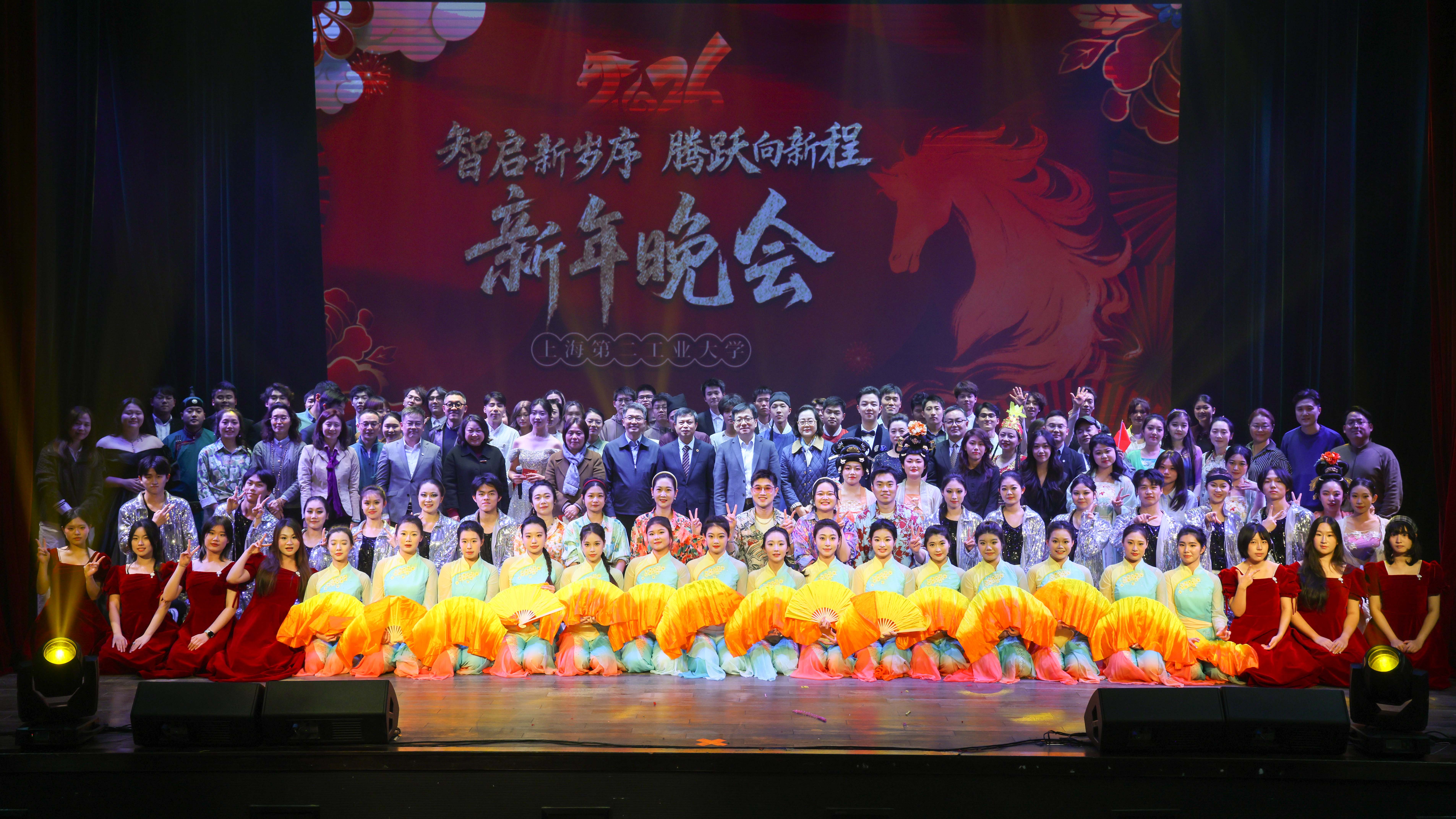 12月29日晚,由艺术与设计学院艺术教育中心、校工会主办的“智启新岁序 腾跃向新程”上海第二工业大学2026年新年晚会在学生活动中心二楼剧场举行。校领导陆敏、谢华清、刘艳、李志清,校外嘉宾以及我校师生近六百人一起观看了演出。当晚有1万人次同时通过线上直播平台观看晚会,点赞数达3.5万次。